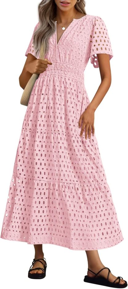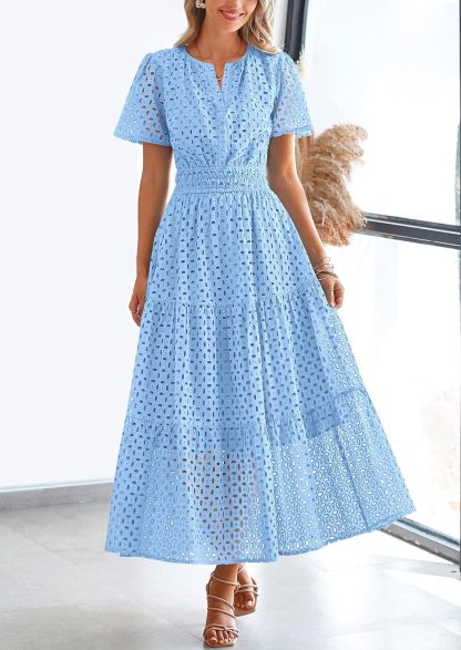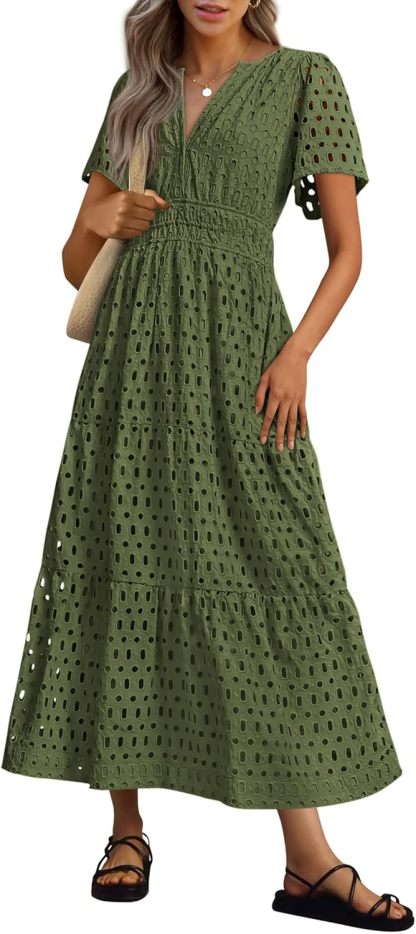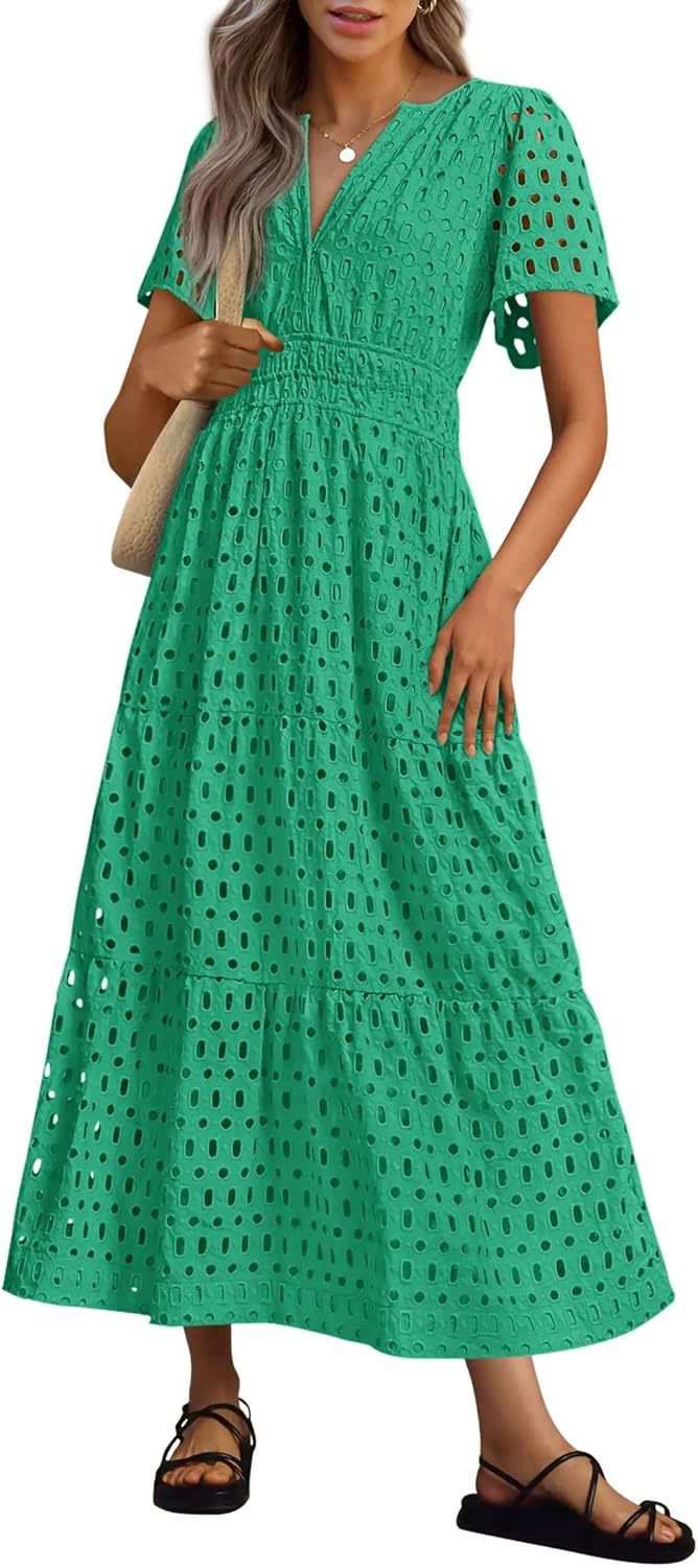 NEW 🔥Womens 2025 Summer Maxi Dress Short Sleeve V Neck Hollow Out Eyelet A Line Dresses