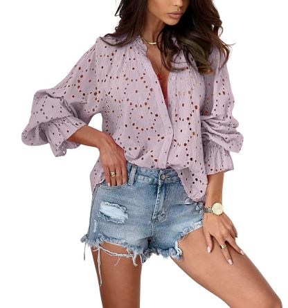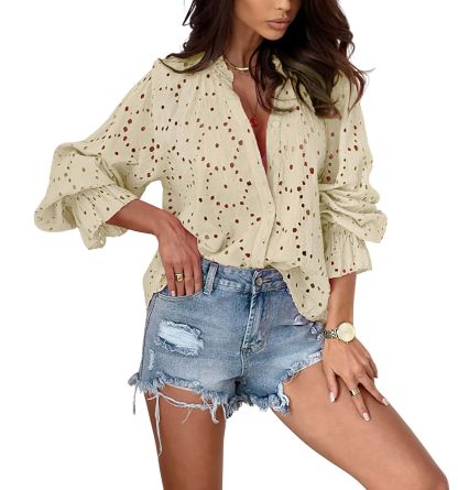 Women's Bohemian Cutout Lantern Sleeve Button Down Blouse